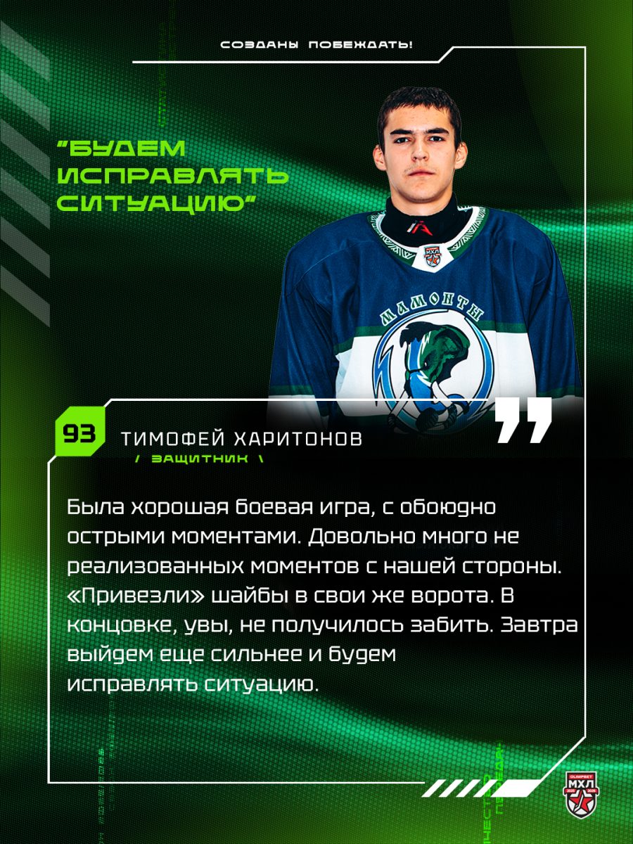 «Была хорошая боевая игра, с обоюдно острыми моментами. Довольно много не реализованных моментов с нашей стороны. «Привезли» шайбы в свои же ворота. В концовке, увы, не получилось забить. Завтра выйдем еще сильнее и будем исправлять ситуацию», — прокомментировал Тимофей.